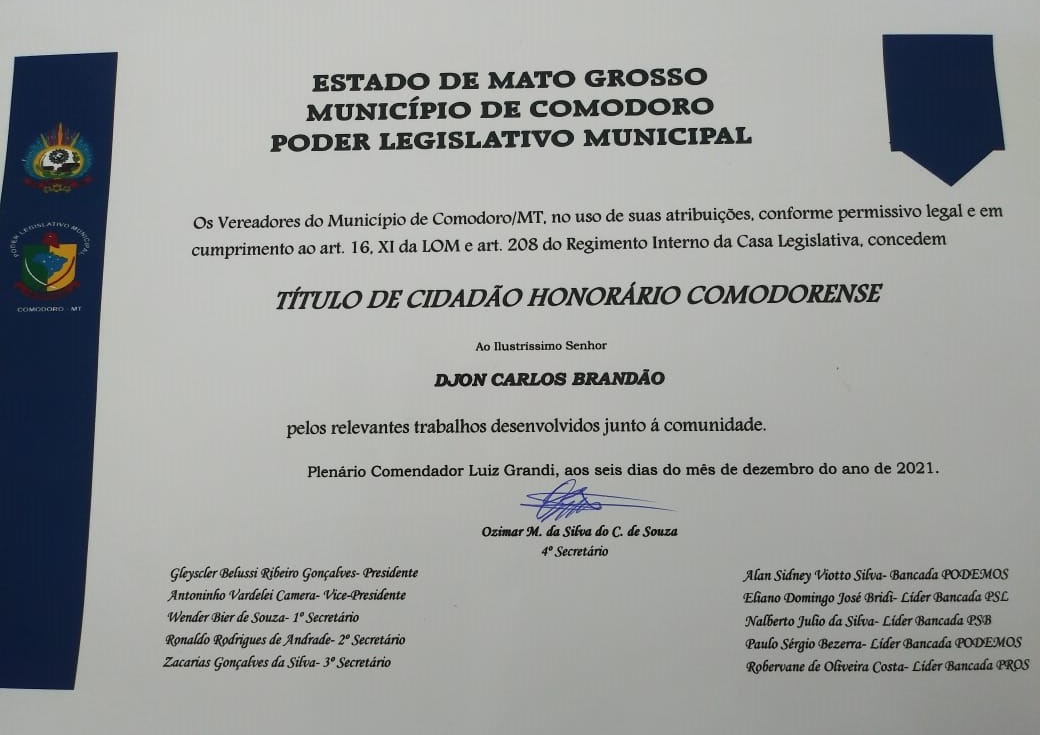 A Câmara Municipal de Vereadores de Comodoro prestou homenagem ao assessor parlamentar Djon Carlos Brandão, com o Título Honorário de Cidadão Comodorense. A entrega do diploma foi concedido em sessão realizada na noite de segunda-feira (6).